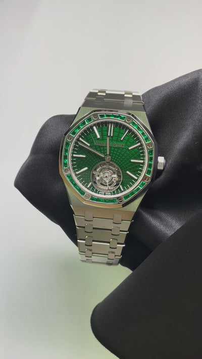 Note: Limited to only 15 pieces worldwide. This is one of the rarest modern Royal Oak references ever produced by Audemars Piguet. The combination of flying tourbillon complication with 32 hand-set baguette emeralds on an 18K white gold bezel makes this an exceptional collector’s piece. Introduced in 2021 as part of AP’s celebrated green dial collection. Case back engraved “LIMITED EDITION” and individually numbered.